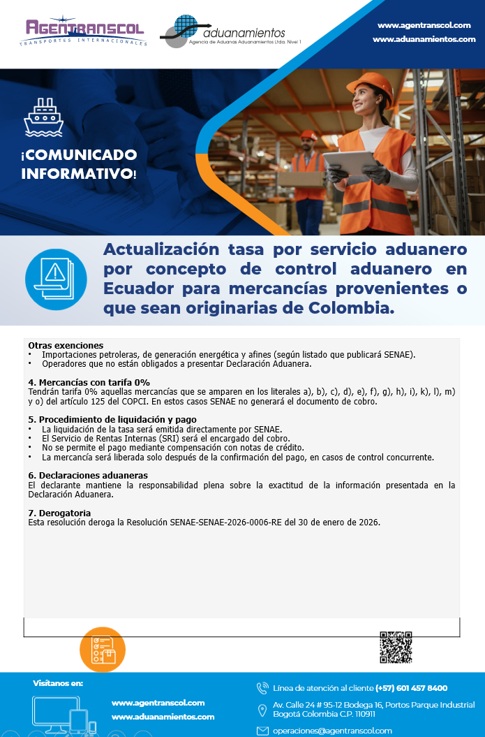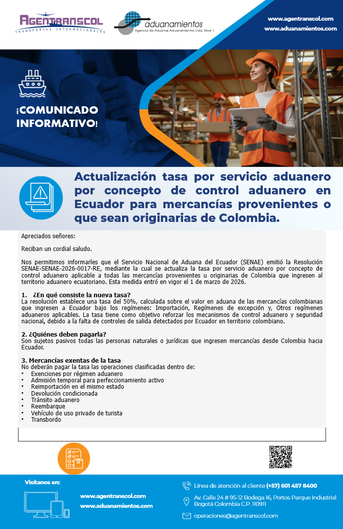 Actualización tasa por servicio AduaneroNos permitimos informarles que el Servicio Nacional de Aduana del Ecuador (SENAE) emitió la Resolución SENAE-SENAE-2026-0017-RE, mediante la cual se actualiza la tasa por servicio aduanero por concept leer más |